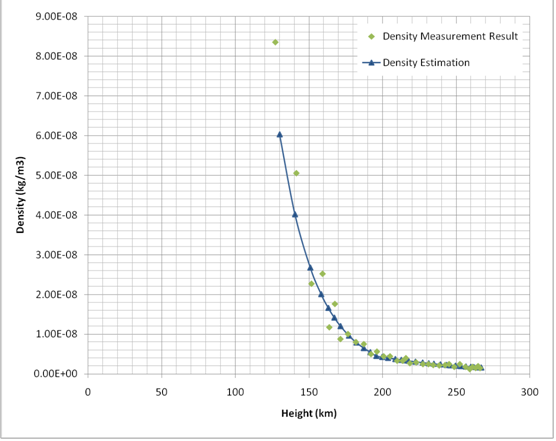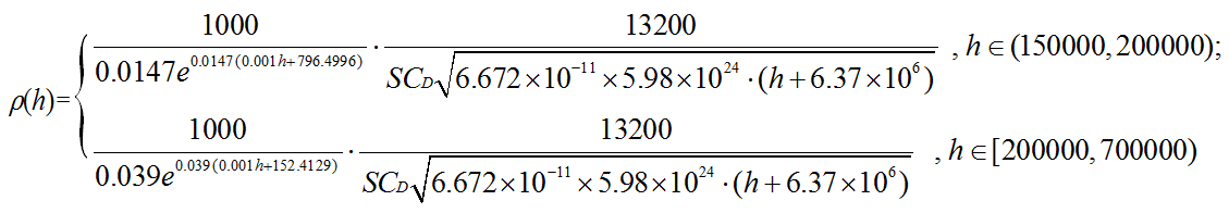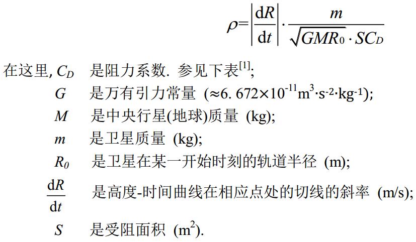 這種模式是否具有實(shí)用意義主要取決于離子在工作環(huán)境中是否充足, 即是說(shuō), 我們首先必須先測(cè)出高層大氣的近似的密度. 又因?yàn)樗? 無(wú)法直接測(cè)量, 我就想出一種間接的方法: 通過(guò)測(cè)量不受控制的近地軌道衛(wèi)星的軌道高度的自然衰減. 由于密度可由作用于衛(wèi)星上的大氣阻力大小求出, 這個(gè)阻力間接地體現(xiàn)在衛(wèi)星高度衰減上, 因此通過(guò)計(jì)算我們得出密度ρ (kg/m3 ):