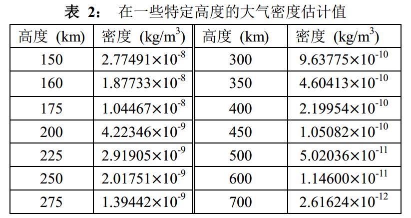 通過(guò)查閱相關(guān)參數(shù)數(shù)據(jù)得到衛(wèi)星質(zhì)量m=13200kg, 并假設(shè)衛(wèi)星受阻面積為16m2, 對(duì)地軌道速度為7800 m/s, 即Ma= 22.9. 從表 1中我們可以得到相應(yīng)的CD=0.11283. 從ρ(h)函數(shù)關(guān)系可以解出如下表所示的在一些特定高度的大氣密度估計(jì)值.