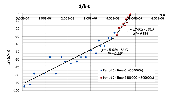 于是, 通過(guò)密集地在曲線上取點(diǎn)然后通過(guò)Excel軟件錄入并處理其t和 h坐標(biāo), 我們可以近似得到曲線在相應(yīng)點(diǎn)上的切線斜率k. 進(jìn)一步地, 通過(guò)建立k和1/t之間的線性回歸模型, 我們可以解決出A和B. 并通過(guò)求估計(jì)高度與實(shí)際高度的差的平均值, 我們可以得C. 綜上我們可以得到以下的密度-高度模型: