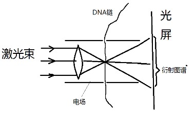 測(cè)序流程:合成一段已知序列的單鏈DNA,要求含有全部A G C T四種核苷酸。在脈沖電場(chǎng)作用下,這段已知序列的帶負(fù)電的DNA單鏈被拉直并一堿基一堿基的通過(guò)納米孔,每通過(guò)一個(gè)堿基便會(huì)出現(xiàn)數(shù)微秒的停頓。低能超細(xì)高頻激光束經(jīng)過(guò)聚焦,在焦點(diǎn)處與剛剛經(jīng)過(guò)納米孔的DNA單鏈相遇,經(jīng)過(guò)衍射,在另一側(cè)的光屏上形成衍射圖譜,由于DNA單鏈的間續(xù)性運(yùn)動(dòng),會(huì)產(chǎn)生間續(xù)性衍射圖譜,以衍射圖譜與DNA序列作對(duì)比,可以得出每種圖譜對(duì)應(yīng)的堿基。