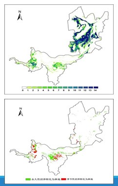 季節(jié)性沼澤減少直接導(dǎo)致珍稀鳥類和魚類食物來源的減少,造成棲息地環(huán)境質(zhì)量下降甚至破壞;季節(jié)性沼澤的喪失和退化將使洞庭湖濕地的生物多樣性降低。最顯著的是西洞庭湖和南洞庭湖區(qū)林地面積的快速增加,主要由沼澤轉(zhuǎn)化而來,如圖,其中永久性沼澤轉(zhuǎn)化為林地共14800 公頃,由季節(jié)性沼澤轉(zhuǎn)化為林地為7900公頃 。