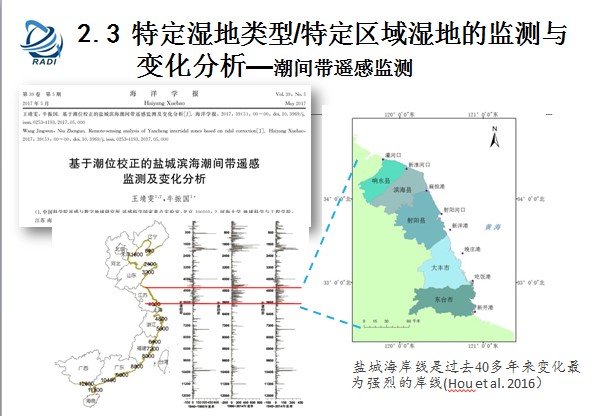 特定濕地類型的監(jiān)測(cè)與變化分析,為什么最近在做特定類型呢?我們發(fā)現(xiàn)監(jiān)測(cè)濕地變化呢,從無到有,從原來不了解,研究了之后發(fā)現(xiàn)我們很多數(shù)據(jù)不足,包括其中很多類型沒有監(jiān)測(cè)到,包括水田用其他的方法補(bǔ)充進(jìn)去了。因?yàn)楹Q鬂q潮的時(shí)候衛(wèi)星每天時(shí)間大概早上5點(diǎn)過境,但是沒法監(jiān)測(cè)潮間帶,所以我們對(duì)潮間帶做了監(jiān)測(cè)。