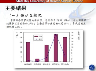 這是《科學(xué)通報(bào)》的封面,雙語的。下面簡(jiǎn)單匯報(bào)一下評(píng)估結(jié)果,中國(guó)91個(gè)國(guó)家級(jí)濕地保護(hù)區(qū),總面積為 26.38萬km2,占全國(guó)國(guó)家級(jí)保護(hù)區(qū)總面積的 29% ;占全國(guó)保護(hù)區(qū)總面積的 18% ;占我國(guó)國(guó)土面積的 2.5% 。類型來看,沼澤濕地保護(hù)區(qū)最多,其次野生動(dòng)物保護(hù)區(qū),第三個(gè)是海洋類型,河流類型最少的。