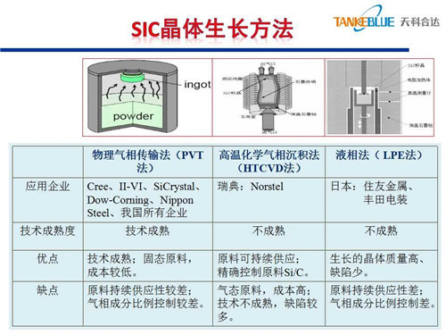 碳化硅襯底的生長(zhǎng)方法有三種:一是物理氣相傳輸法,該技術(shù)相對(duì)成熟,性價(jià)比高;二是高溫化學(xué)氣相沉積法,優(yōu)點(diǎn)是原料可持續(xù)供應(yīng),可精確控制原料中的碳硅比;三是液相法,尚處于研究階段。
