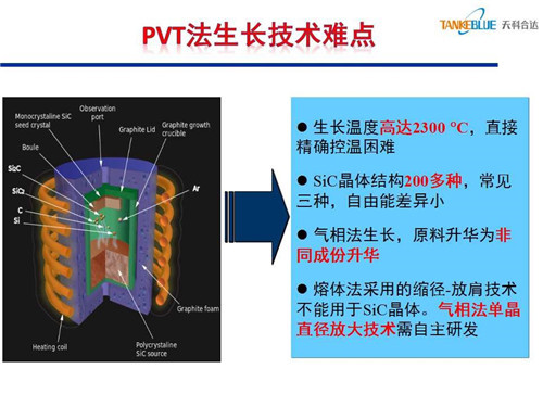 PVT法生長(zhǎng)碳化硅存在以下技術(shù)難點(diǎn),一是晶體生長(zhǎng)溫度高達(dá)2300℃,直接精確控溫困難;二是很難獲得單一的碳化硅晶體結(jié)構(gòu);三是生長(zhǎng)時(shí)原料易升華為非同成份其他物質(zhì);四是熔體法采用的縮徑-放肩技術(shù)不適用于氣相法碳化硅晶體生長(zhǎng),氣相法單晶直徑放大技術(shù)需自主研發(fā)。