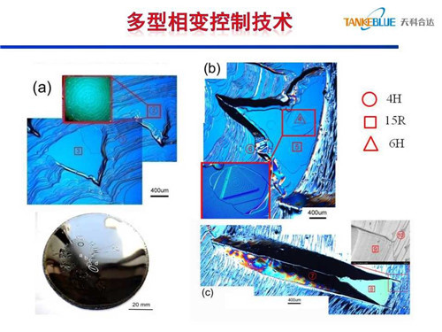 碳化硅晶體生長(zhǎng)時(shí)如果臺(tái)階過(guò)寬,晶型沿 [0001] 方向的排列信息反應(yīng)不出來(lái),會(huì)在臺(tái)階上自發(fā)成核,發(fā)生晶型轉(zhuǎn)變。研究發(fā)現(xiàn),當(dāng)晶體表面不光滑、不平整時(shí),易發(fā)生多型相變,4H會(huì)發(fā)生6H和15R相變。另一方面晶型轉(zhuǎn)變與生長(zhǎng)室氣氛相關(guān),通過(guò)控制生長(zhǎng)室氣氛解決了多型相變技術(shù)。