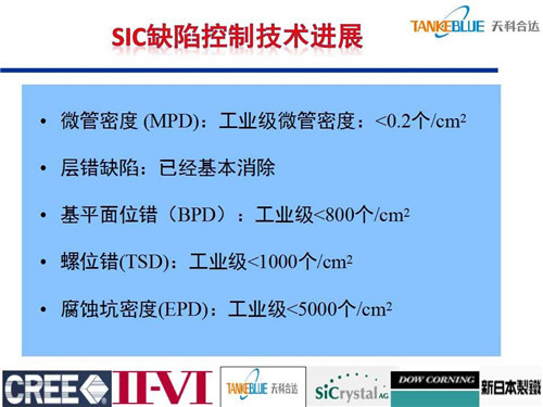 目前工業(yè)級(jí)碳化硅襯底微管密度小于0.2個(gè)/cm2,層錯(cuò)缺陷基本消除,基平面位錯(cuò)工業(yè)級(jí)襯底小于800個(gè)/cm2。經(jīng)預(yù)測(cè),2019年碳化硅襯底市場(chǎng)約為3.5億美金,主要包括電力電子和微波領(lǐng)域,加上LED等其他領(lǐng)域應(yīng)用,大概為8億美金。