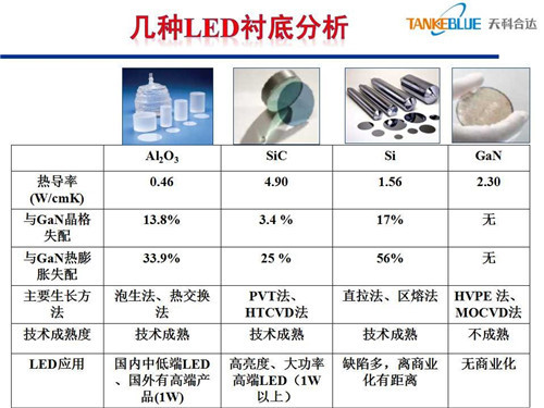 但是在這里面我們今天講的主要是藍(lán)寶石、碳化硅,剛才在講的時(shí)候我思考幾個(gè)問(wèn)題,這幾個(gè)材料在發(fā)光效率上藍(lán)寶石可以做到150lm/W,碳化硅可以做到200lm/W,在發(fā)光效率上確實(shí)體現(xiàn)差異。在物理基礎(chǔ)參數(shù)上體現(xiàn)了差異,比如說(shuō)跟氮化鎵外延,從晶格匹配上,碳化硅上長(zhǎng)氮化鎵確實(shí)好一些,藍(lán)寶石失配大一些,直接影響外延的質(zhì)量。另外導(dǎo)電性、熱導(dǎo)率也是有差異的。