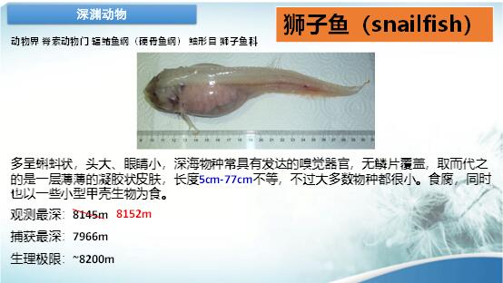 目前,對(duì)海斗深淵的生物系統(tǒng)還沒(méi)搞清楚。在海斗深淵,壓力是1噸/平方厘米、溫度低、光線暗、幾乎就是黑暗、地震也多。這里的生物的生命真是奇特,能在這樣的環(huán)境中生存和繁殖。我們的儀器下潛到水深萬(wàn)米一下,也要經(jīng)受1噸/平方厘米的壓力,在設(shè)計(jì)上會(huì)遇到很多問(wèn)題。