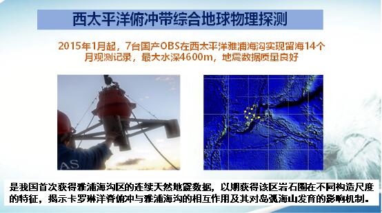 在2015年,我國(guó)在西太平洋雅浦海溝投放了7臺(tái)海底地震儀,留海觀測(cè)時(shí)間是14個(gè)月,最大的水深是4600米。記錄的地震波形都很好。主要用于揭示巖石圈在不同構(gòu)造尺度的特征,了解卡羅琳洋脊俯沖與雅浦海溝的相互作用及對(duì)島弧海山發(fā)育的影響機(jī)制。