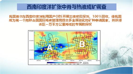 在全球的海洋中,大部分海洋為公海,有些國(guó)家已圈出自己具有礦產(chǎn)調(diào)查和開采權(quán)的某片海域。我們國(guó)家在西南印度洋布設(shè)了“中國(guó)結(jié)”的地震臺(tái)網(wǎng),開展三維地震觀測(cè)。并第一個(gè)向聯(lián)合國(guó)國(guó)際海洋海底管理局申請(qǐng),獲得了這一地區(qū)一萬(wàn)平方公里的多金屬硫化礦物的專屬開采權(quán)。