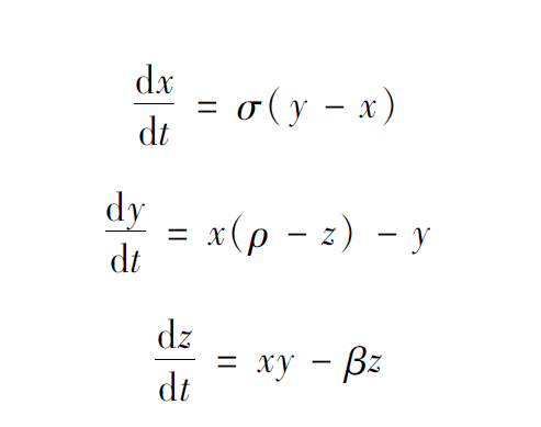 剛才講的Logistic映射是一個離散動力系統(tǒng),下面給出一個連續(xù)動力系統(tǒng)的例子,該系統(tǒng)非常有名,叫作洛倫茲系統(tǒng),是1969年洛倫茲在研究氣象模型時(shí)提出的: