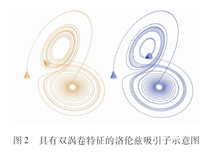 洛倫茲系統(tǒng)其實(shí)就是一個簡單的三維自治ODE方程組,洛倫茲發(fā)現(xiàn)在某些參數(shù)下該系統(tǒng)會出現(xiàn)混沌行為。圖2給出了洛倫茲系統(tǒng)具有雙渦卷特征的混沌吸引子相圖,注意其軌道是永不重復(fù)的。