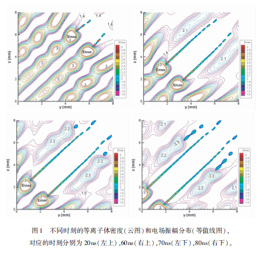 下面看一下相交微波束大氣擊穿的模擬結(jié)果,我們首先算了同頻率微波相交的情況,此時(shí)相干疊加之后,由于干涉作用,會形成電場強(qiáng)度強(qiáng)弱分布。我們首先模擬一下種子電子在弱場區(qū)的情況。因?yàn)樵诖髿庵蟹N子電子是偶然出現(xiàn)的,有可能出現(xiàn)弱場區(qū),如果出現(xiàn)在弱場區(qū),它需要擴(kuò)散,擴(kuò)散到強(qiáng)場區(qū)之后電子碰撞分子發(fā)生雪崩電離,形成的等離子體沿著強(qiáng)場區(qū)做趨源運(yùn)動,運(yùn)動方向沿著)=:的這條線。形成的等離子體的區(qū)域是一個等離子體絲帶,當(dāng)然如果把氣壓降低,會發(fā)現(xiàn)絲帶就會過渡為一個等離子體帶。圖1給了幾個典型時(shí)刻的等離子體密度分布和場強(qiáng)的分布,在20ns的時(shí)候,由于靠近等離子體區(qū)域最強(qiáng)的場是沿著)=:這條線的,當(dāng)?shù)入x子體絲帶長度增加到一定程度的時(shí)候,在其左上和右下區(qū)域,相當(dāng)于把兩個微波場隔開,這兩個區(qū)域相當(dāng)于只有一個單微波的作用,在兩邊有新的等離子體絲帶。如果初始電子出現(xiàn)在強(qiáng)場區(qū),電子碰撞分子就會雪崩電離,形成等離子體。等離子體區(qū)域也是沿著J=:這條線做趨源運(yùn)動。下面簡單比較了同頻和非同頻微波相交的大氣擊穿,同頻相當(dāng)于相干疊加,非同頻相當(dāng)于非相干疊加,模擬時(shí)間都是80ns,初始的種子電子數(shù)都一樣,可以發(fā)現(xiàn)在相干的情況下,即使把種子電子源放到場強(qiáng)最小的地方,產(chǎn)生等離子體的區(qū)域也大于非相干的情況,而且產(chǎn)生的最大電子數(shù)也是大于非相干的情況??偨Y(jié)主要有三點(diǎn),一個是區(qū)域隨壓強(qiáng)的變化,還有等離子體做趨源運(yùn)動,還有相干比非相干的等離子體區(qū)域比較大。