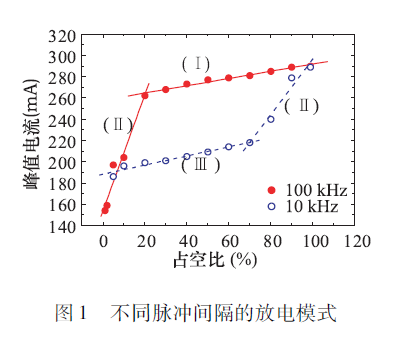 如果兩個脈沖間隔比較近,那么跟連續(xù)就沒什么差異,因?yàn)槊}沖撤銷以后,即射頻消失以后,電極間還存在的空間電荷,也就是有電子和離子分離存在,這些電子在第二脈沖上來后就會參與放電,這時(shí)與連續(xù)放電差異性就不大了。如果脈沖間隔范圍足夠?qū)挘@就成為兩個不同的放電,兩個放電之間是不相關(guān)的。如圖1( I)是脈沖之間間隔非常小的時(shí)候,稱為連續(xù)模式;下面的Ⅲ是脈沖之間間隔非常大的時(shí)候,稱為分離模式,我們可以看到整個放電的峰值電流要小不少。在它們之間,(II)稱為傳輸模式,在兩個脈沖之間,電子沒有完全消亡的情況下放電電流與占空比的關(guān)系。共有上述三個過程,可見脈沖的間隔長短對放電的影響不是由占空比決定,主要是考慮電極之間間距和里面所參與的空間電荷分布變化。