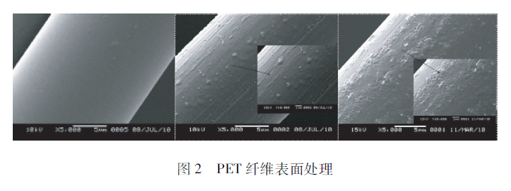 用長50cm、間距5cm的電極板做了一個射頻的放電模式。我們用上面介紹的JET做了滅菌實(shí)驗(yàn),細(xì)菌的存活數(shù)量得到了有效的下降。在這里主要看一下對化纖的處理效果,圖2的左圖是沒有處理過的,中圖是200 W處理的,右圖是800 W處理的。這兩個之間有什么區(qū)別呢?中圖顯示纖維表面有溝槽出來,這任何化纖在等離子體處理情況下刻蝕的一個特征,在低真空情況下的射頻放電都會有溝槽刻蝕出來。但是在大氣壓輝光放電的情況下,表面有許多圓形體產(chǎn)生。我認(rèn)為不單純有刻蝕,而且有表面熔融的狀態(tài)出來。所以說,在大氣壓射頻放電對表面的作用是相當(dāng)強(qiáng)的。雖然每個脈沖時(shí)間比較短,但是它的作用非常強(qiáng)。